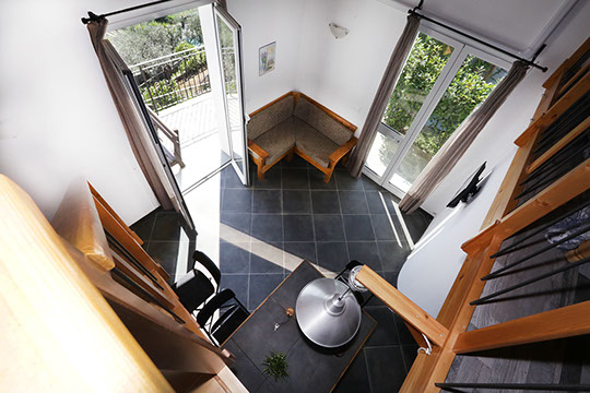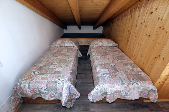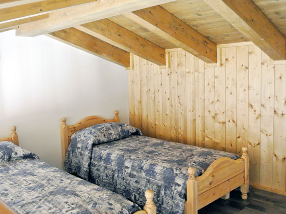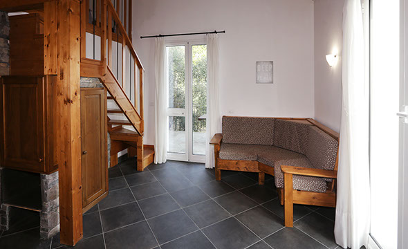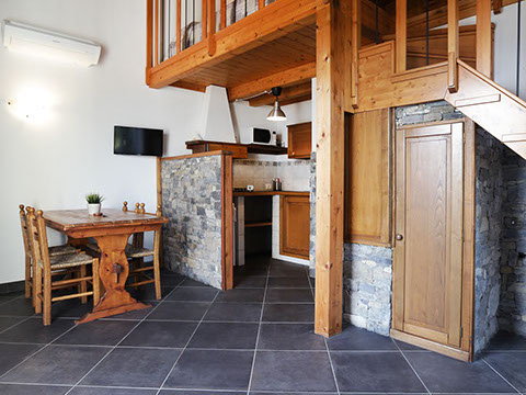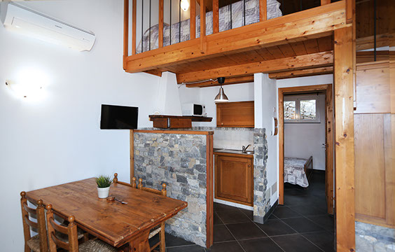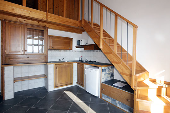 It consist of a dining/living room with kitchen fully equipped, Tv, a big wooden mezzanine with 2 single beds, double room and bathroom.